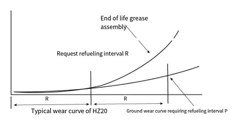 Kun HZ20 holkki asennetaan rasvalla, kuten litiumpohjaisella tai silikonirasvalla. Sen käyttöikä vaihtelee PV-arvosta käyttökunnossa. esimerkiksi. kun PV-arvo on noin 2,5 MPam/s. sen käyttöikä on noin 200 tuntia; kun PV-arvo on 0,1Mpa-m/s, sen käyttöikä voi olla yli I0,0oohr (katso lisätietoja taulukosta) HZ20 holkin voiteluhuoltojakso R on noin puolet sen käyttöiästä. Esimerkiksi kun PV = 25 Mpam/s. se on voideltava öljyllä 100 tunnin välein.