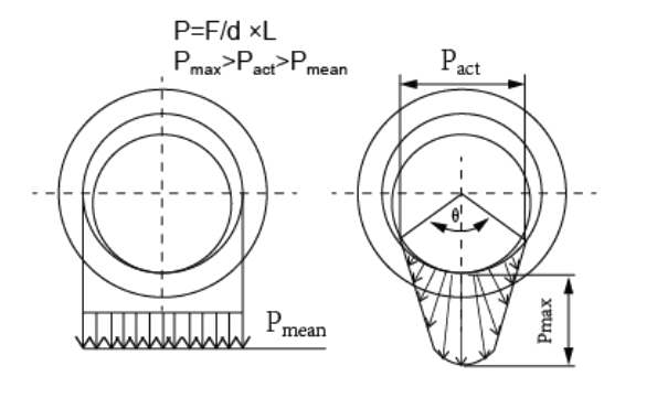 Välystekijänä holkkien viiste, öljyura jne. Todellinen kuorma (Pact) on suurempi kuin laskentateoria (Pmean).